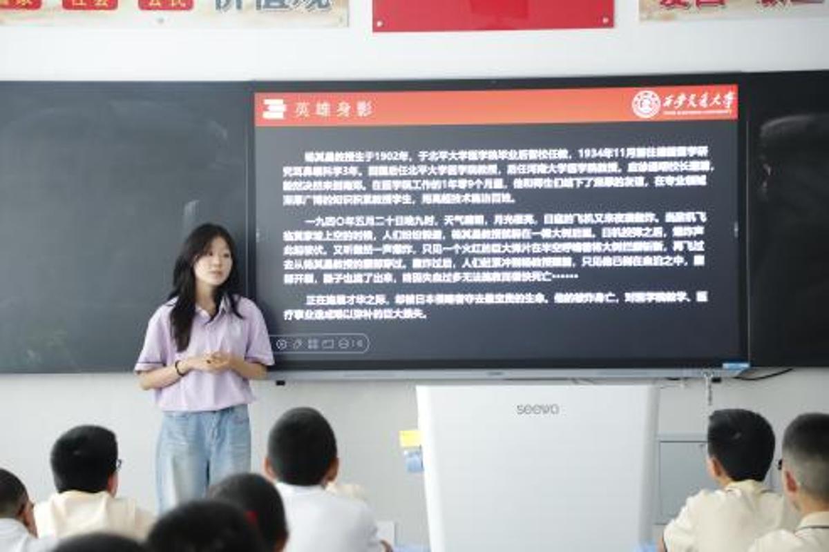 实践队成员紧扣时代脉搏与青年使命,通过讲述感人至深的奋斗故事和卓越人物的光辉历程,引导中学生从楷模中汲取精神力量,感悟奉献担当,砥砺强国之志。